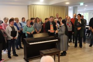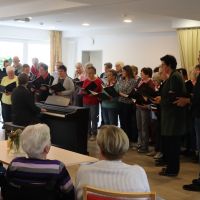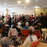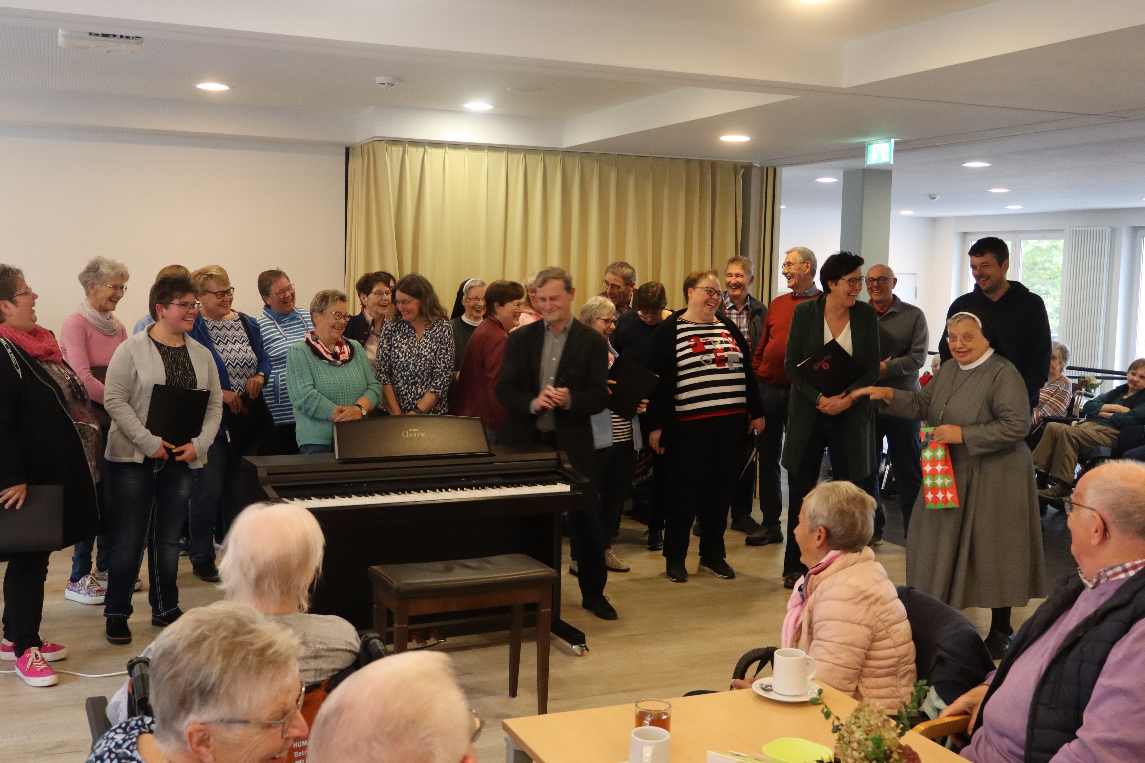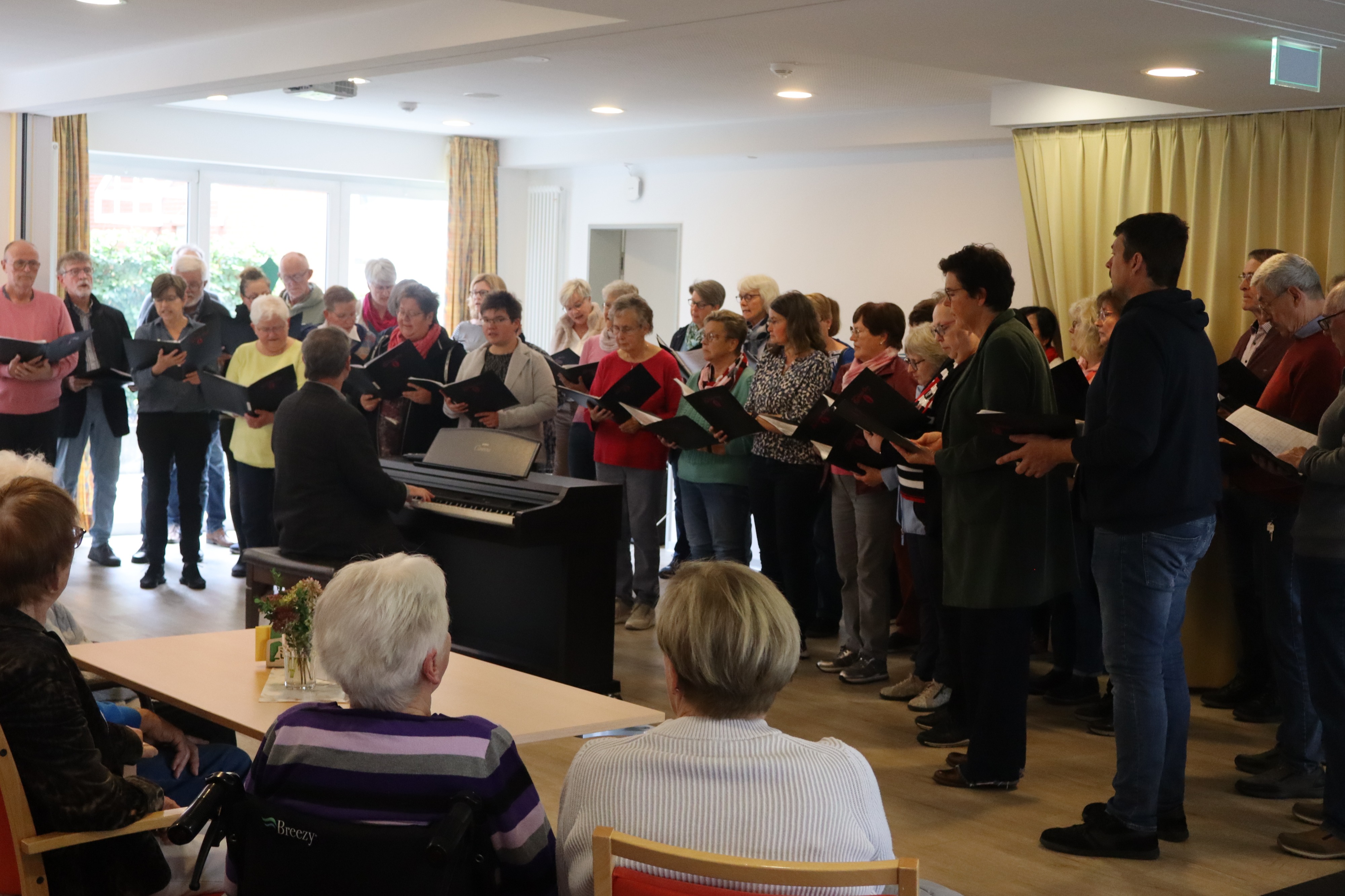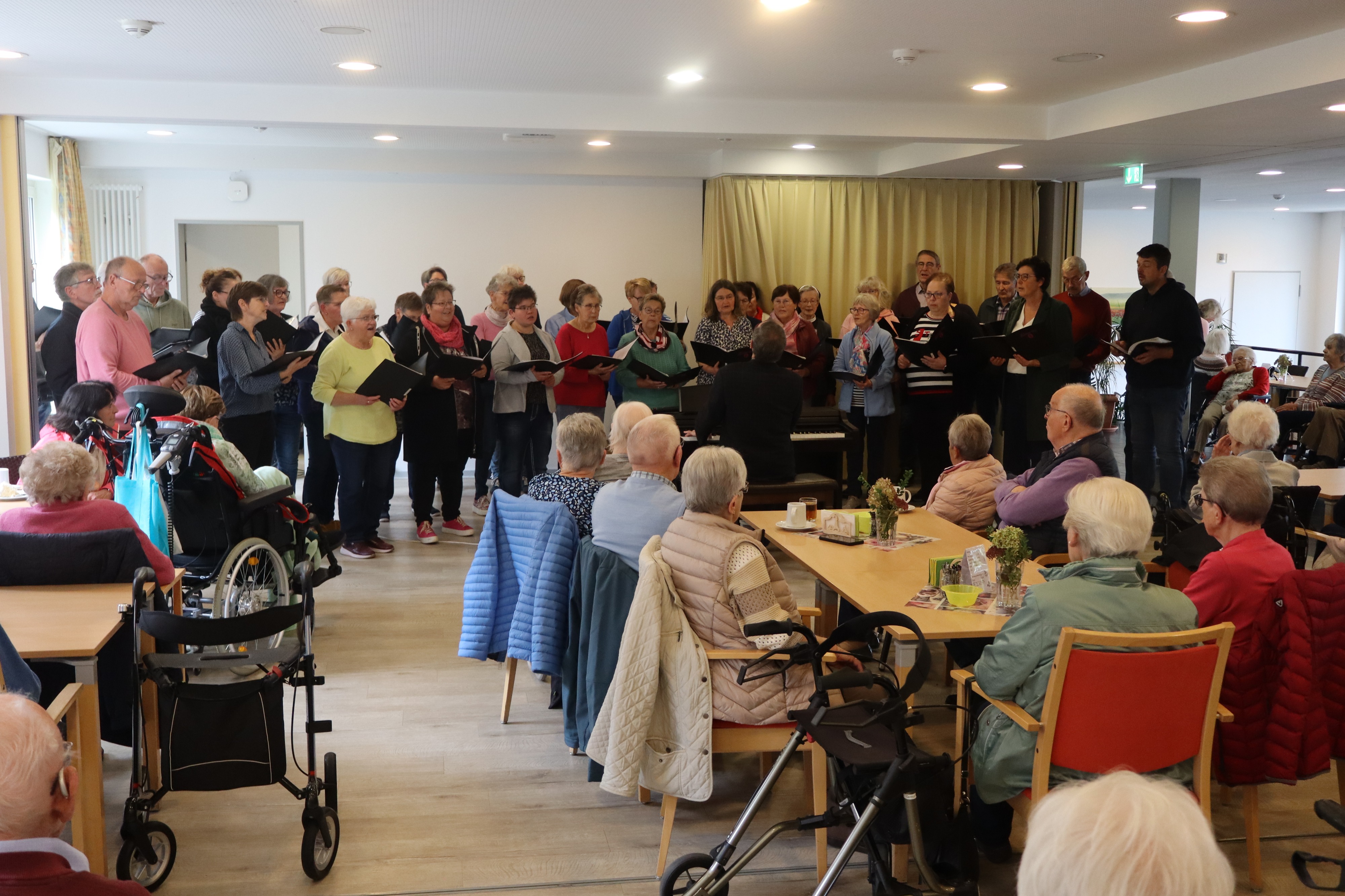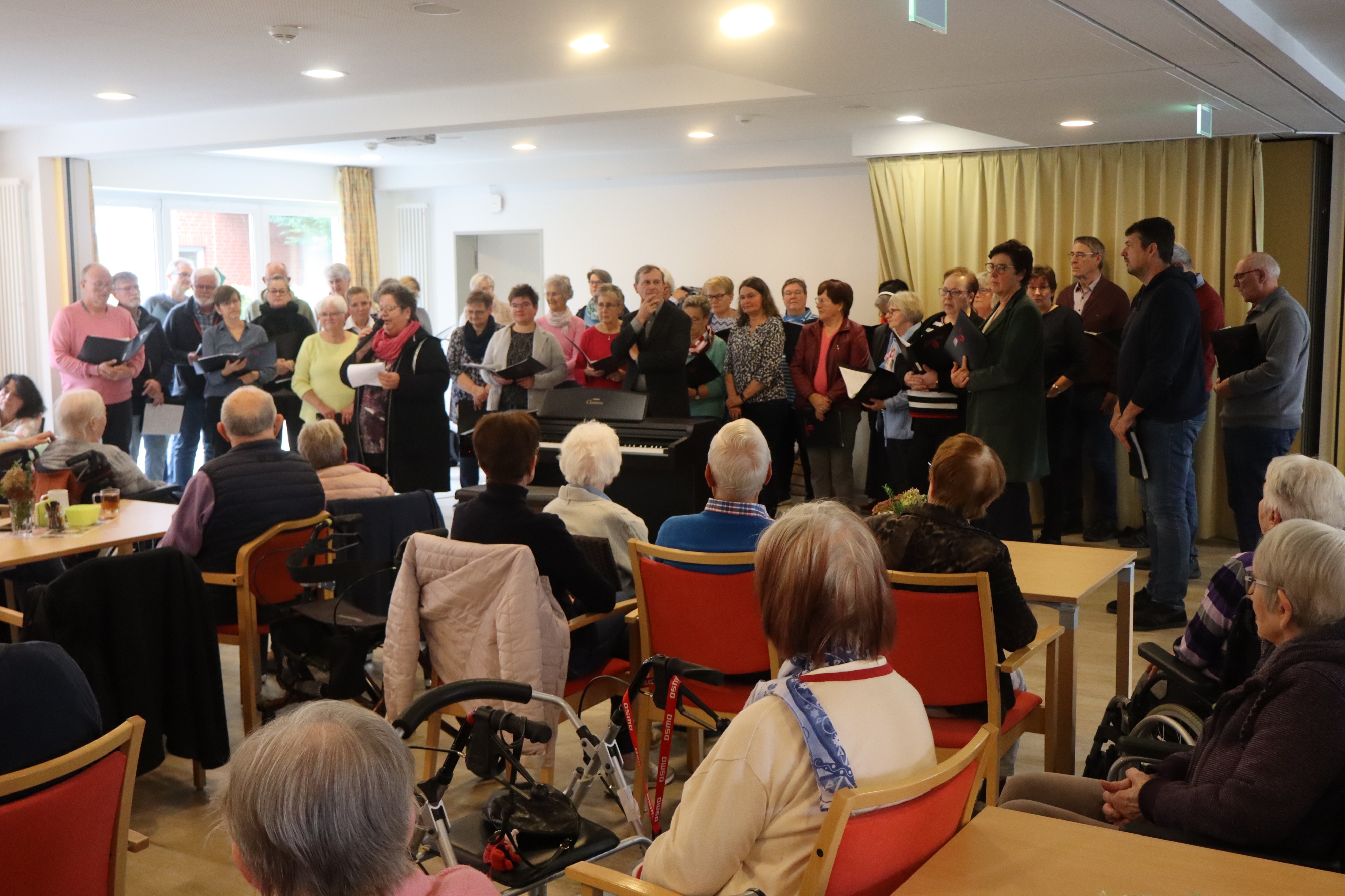 13.10.2025Am Samstagnachmittag, den 11.10.2025, besuchte der Martinus Chor aus Hagen unser Café. Viele Bewohner aus unserem Haus und aus den Seniorenwohnungen waren mit Familienangehörigen zu diesem Chorauftritt gekommen und freuten sich über den wunderbaren Gesang. Nach dem 1. Lied mit dem Motto des Heiligen Jahres „Pilger der Hoffnung“ begrüßte die Chorvorsitzende Marion Martin die Gäste, erläuterte die Auswahl und Reihenfolge der Lieder und hob den Chorleiter Josef Berger hervor, der mit großer Fachkompetenz und lebendigem Engagement den Chor dirigiert und gleichzeitig auf dem Piano begleitet. Die Bewohner und Gäste des Hauses waren begeistert von der gelungenen musikalischen Darbietung, die mit dem Hagener Heimatlied einen Höhepunkt fand. Die Aufführung des Martinus Chors sorgte für einen frohen Nachmittag , der wohl allen in guter Erinnerung bleibt.