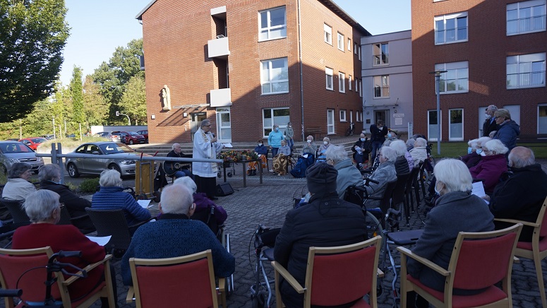 Einige Tage nach dem kalendarischen Herbstanfang begrüßte Einrichtungsleiter Florian Schönhoff am Donnerstag den 30. September 2021 auf dem Vorplatz des Sankt-Anna-Stiftes, Bewohner, Gäste der Tagespflege sowie Mitarbeiter des Hauses zur Erntedankfeier.