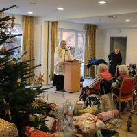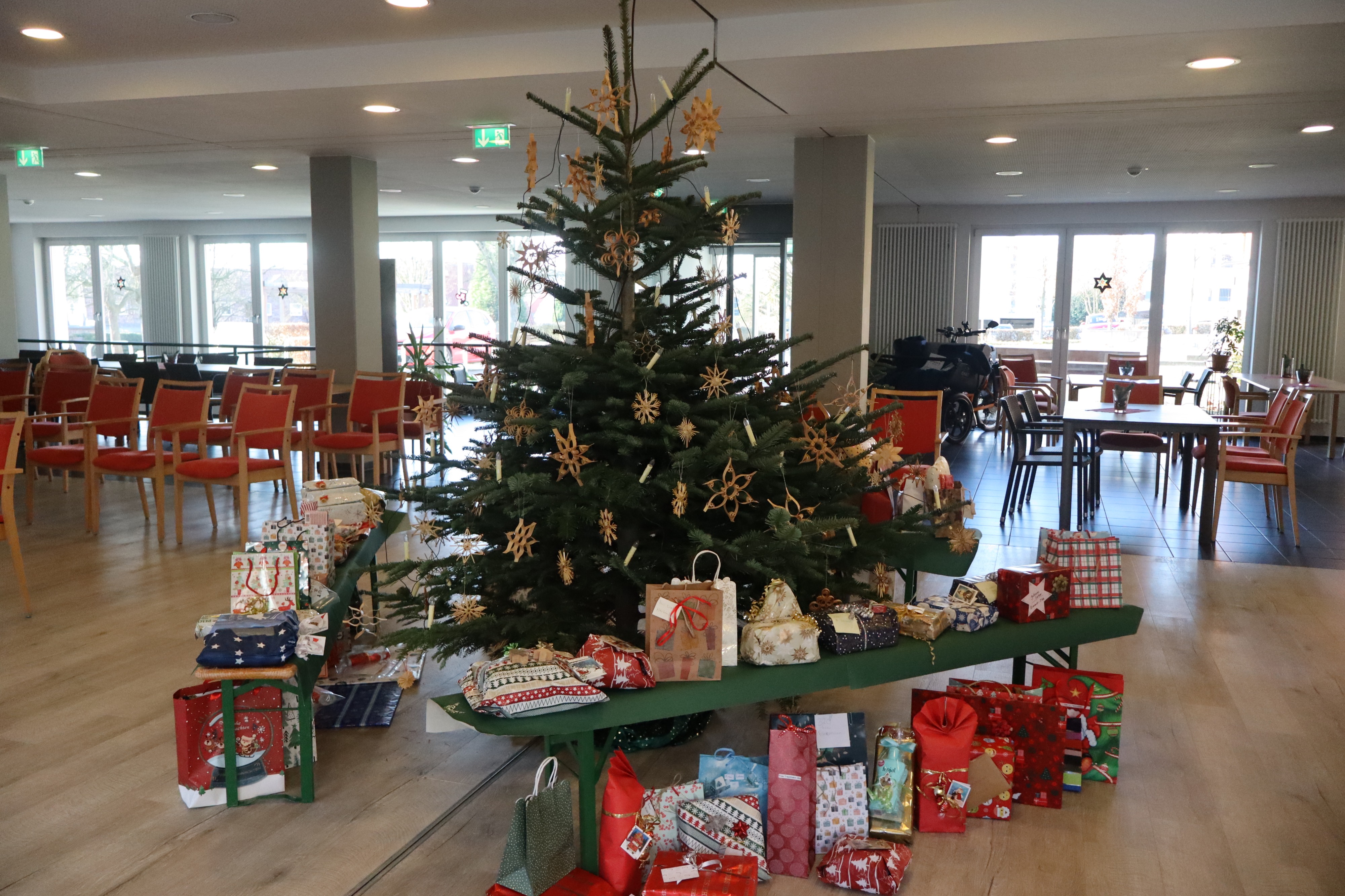 24.12.2025Zur Heiligabendfeier kamen fast alle Bewohner in den festlich geschmückten Saal. Der mit Strohsternen geschmückte Weihnachtsbaum in der Mitte leuchtete mit seiner Lichterkette. Um den Weihnachtsbaum waren für jeden Bewohner liebevoll ausgesuchte und eingepackte Päckchen vom Personal aufgestellt.