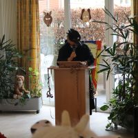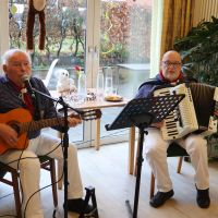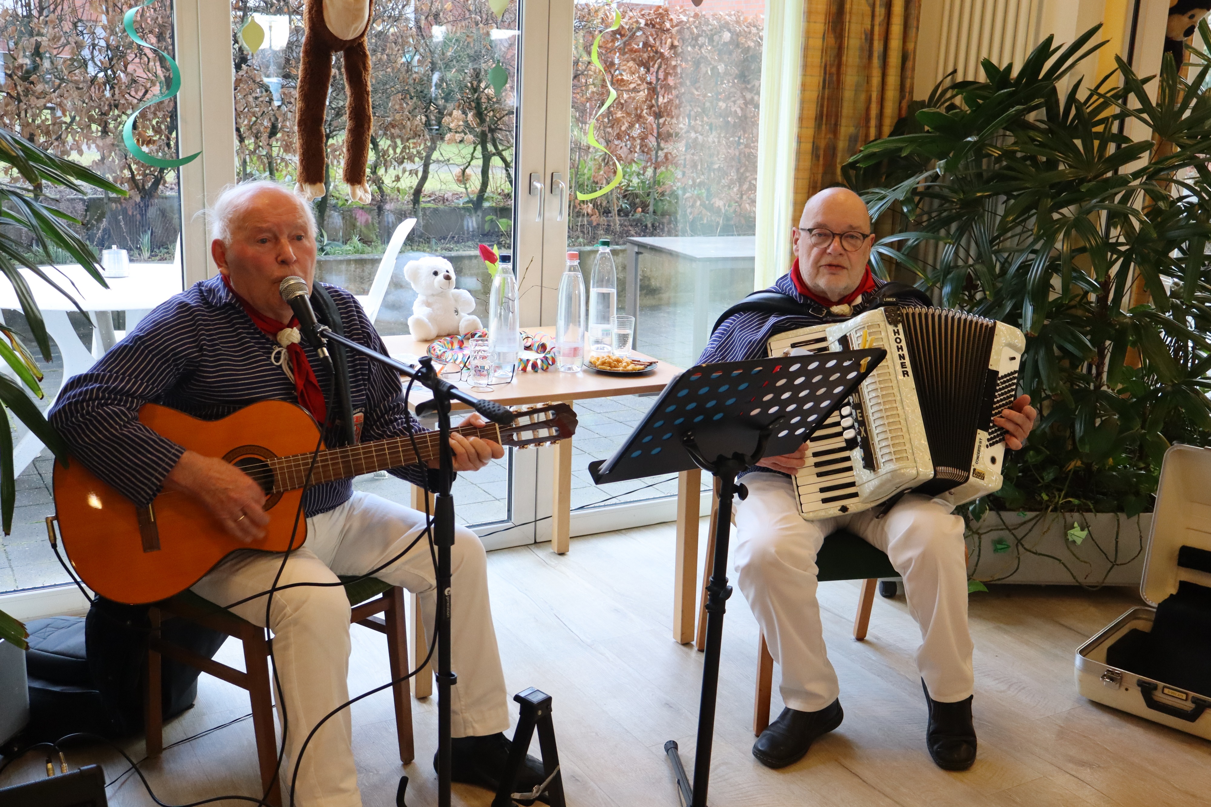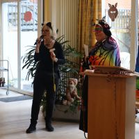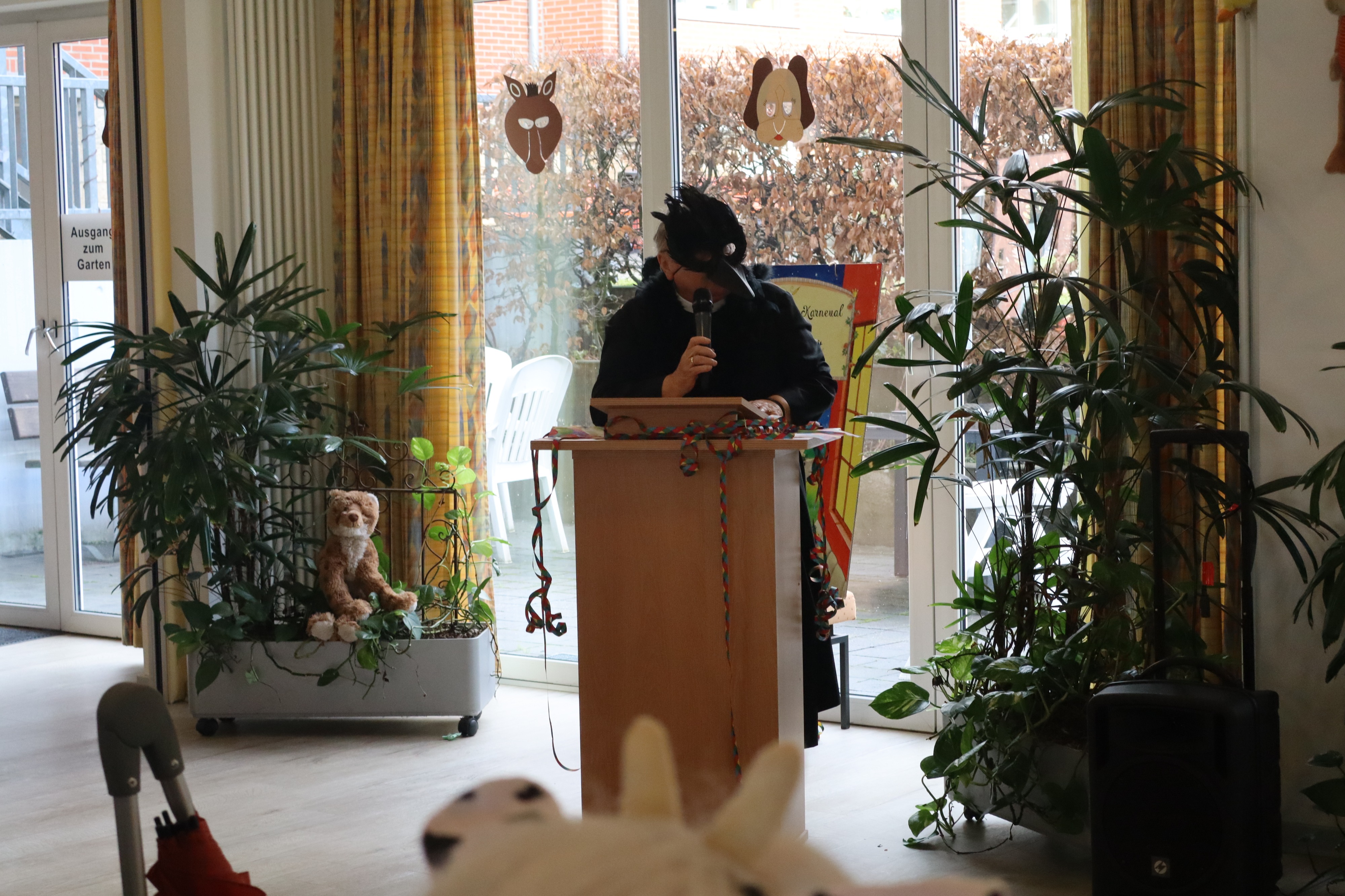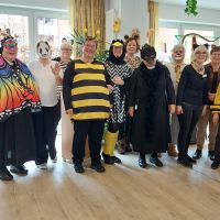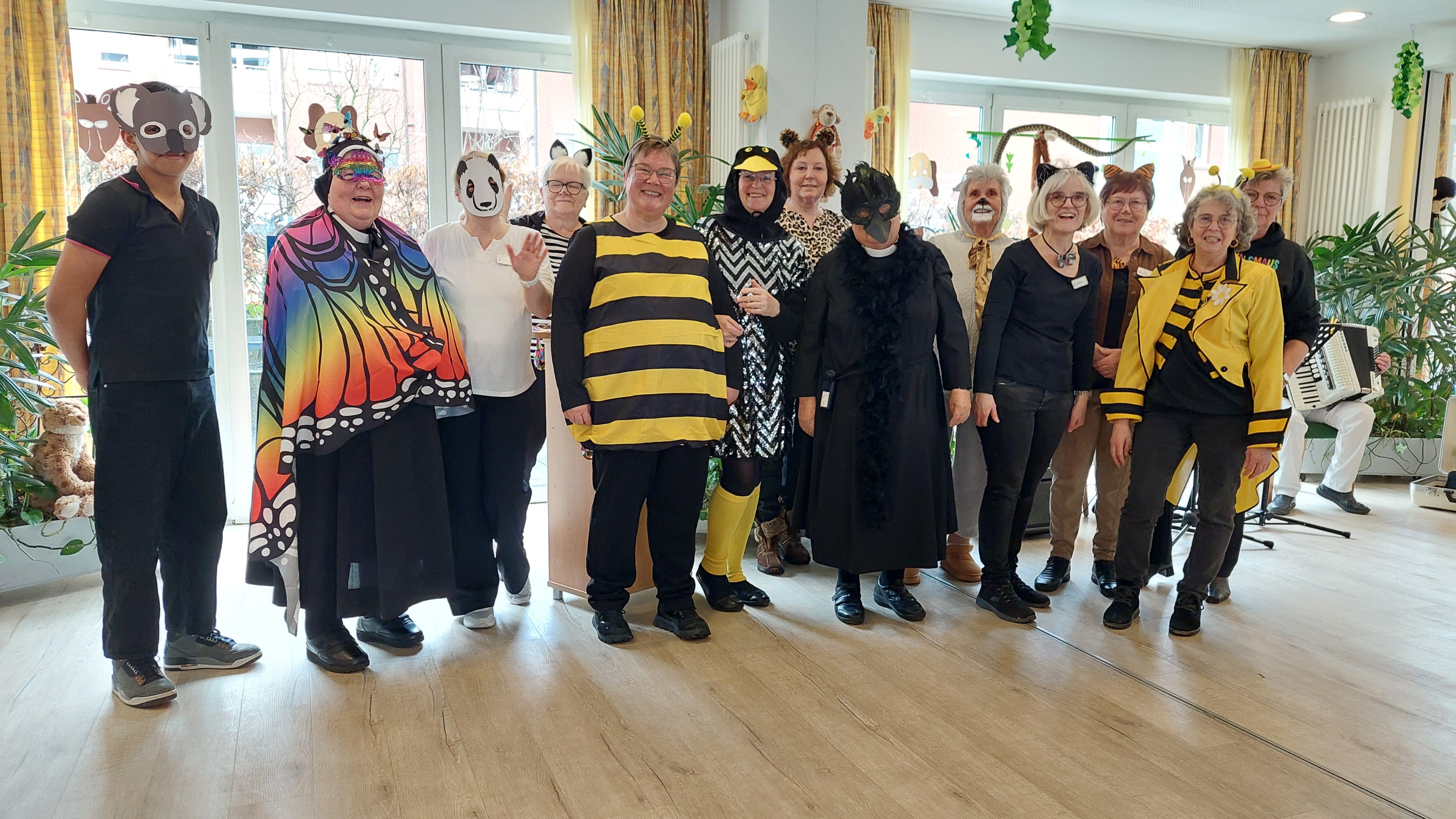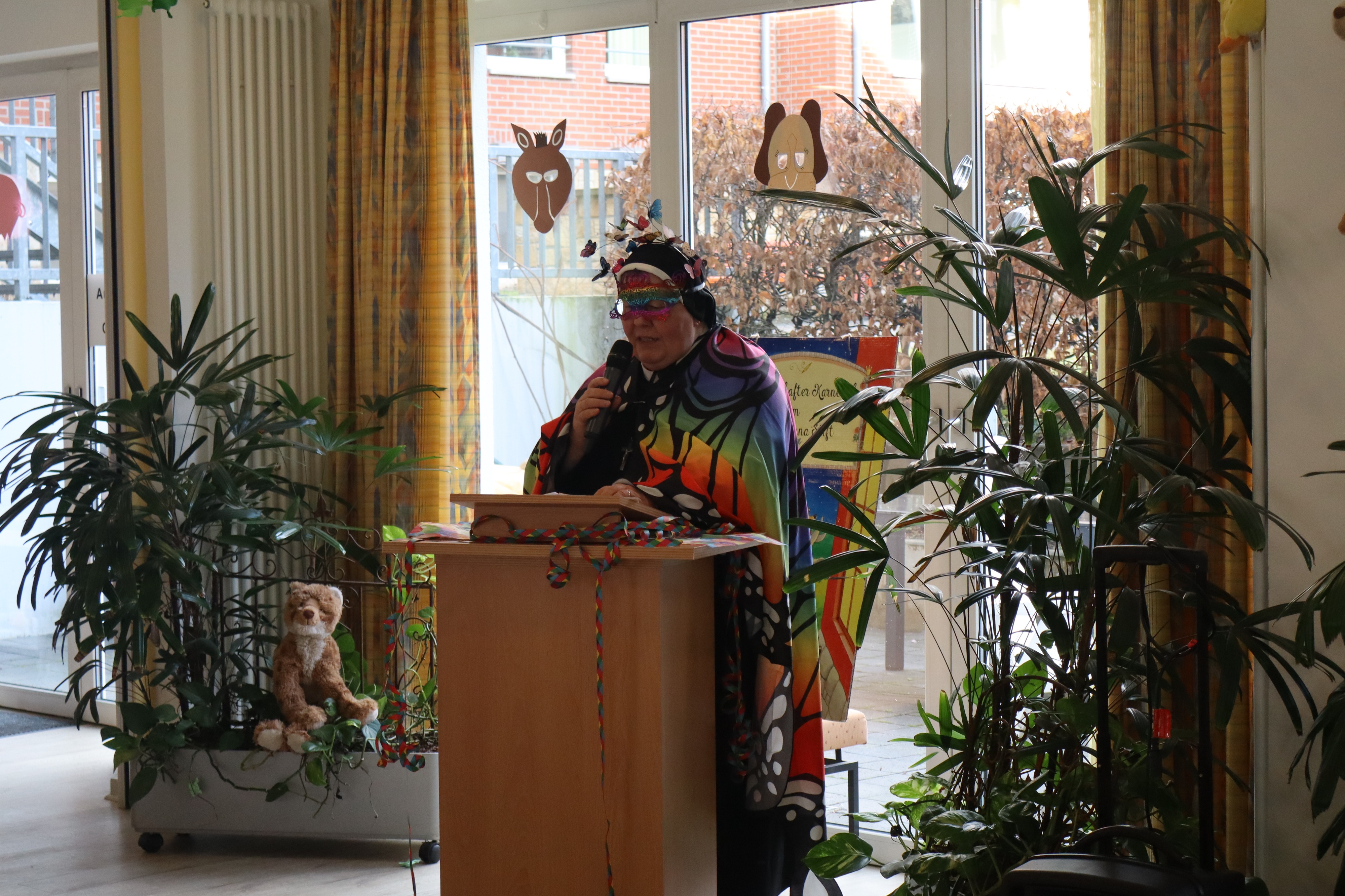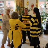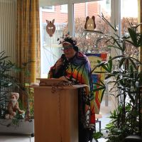 Ein paar Tage vorher, hatten sich schon Bewohner, die Betreuung und Ehrenamtliche zur Vorbereitung getroffen, aus verschiedenen grünem Krepppapier wurden Girlanden angefertigt. Die dann in der Karnevalwoche zur Dekoration aufgehangen wurden. Eine Bewohnerin hatte mehre verschieden Tiermasken angefertigt. Eine Ehrenamtliche brachte noch viele Stofftiere mit, die an verschiedenen Stellen im Saal einen Platz erhielten. Blumen wurden umgestellt. Es sah schon richtig nach Dschungel aus. In dem gut gefüllten Saal begrüßte Schwester Johanna Maria, die kaum zur erkennen war als schwarzer Vogel, das Publikum, die sich zum Teil auch mit Masken oder ähnlichem verkleidet hatten. Günter Altevogt mit Gitarre und Manfred Plogmann mit Akkordeon ließen stimmungsvolle Lieder erklingen. Frau Baller führte durch das Programm, als erste begrüßte sie Schwester Maria Dominik , die als Schmetterling angeflogen kam. Sie hatte einen lustigen Beitrag mitgebracht , verteilte vorher noch Liederzettel, so dass alle die mochten zwischendurch an passenden Stellen mitsingen konnten. Mit viel Applaus wurde sie verabschiedet, Mit Eierlikör in Schokowaffeln gab es eine kurze Pause. Dann kam die Kindertanzgruppe von Frau Brune, 8 Mädchen, die extra drei Tänze einstudiert hatten, die sich mutig vorführten. Auch die Gruppe wurde mit einer Rakete verschiedet, jedes der Kinder erhielt eine Kleinigkeit als Dankeschön und zur Erinnerung. Frau Brune freute sich über einen Blumenstrauß. Dann kam natürlich auch wie in jedem Jahr der Shanty Chor, unter der Leitung von Olga Dahlke, die auch ein buntes Programm vorbereitet hatten. Zwischendurch wurde geschunkelt, mitgesungen und getanzt. Eine wunderbare Stimmung war im ganzen Saal, zwischendurch gab es ein kühles Getränk zur Stärkung, bis der Shanty Chor sich auch verabschiedete. Auch Frau Dahlke freute sich über einen Blumenstrauß für das schöne Programm. Ein Dankeschön auch nochmal an unsere Musiker, an unsere Schwestern, die Betreuung und alle, die mitgeholfen hatten, das Fest so schön zu gestalten.