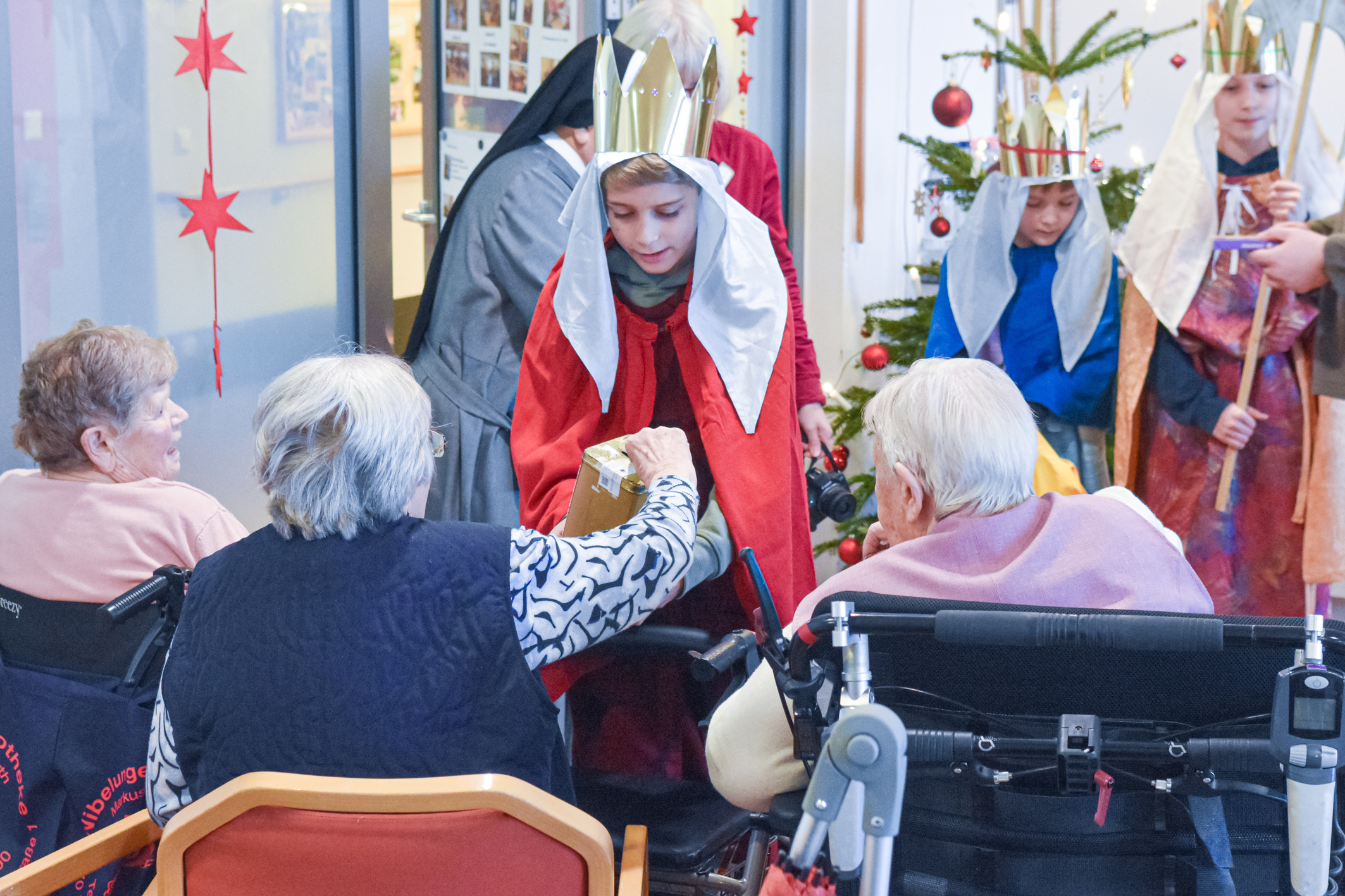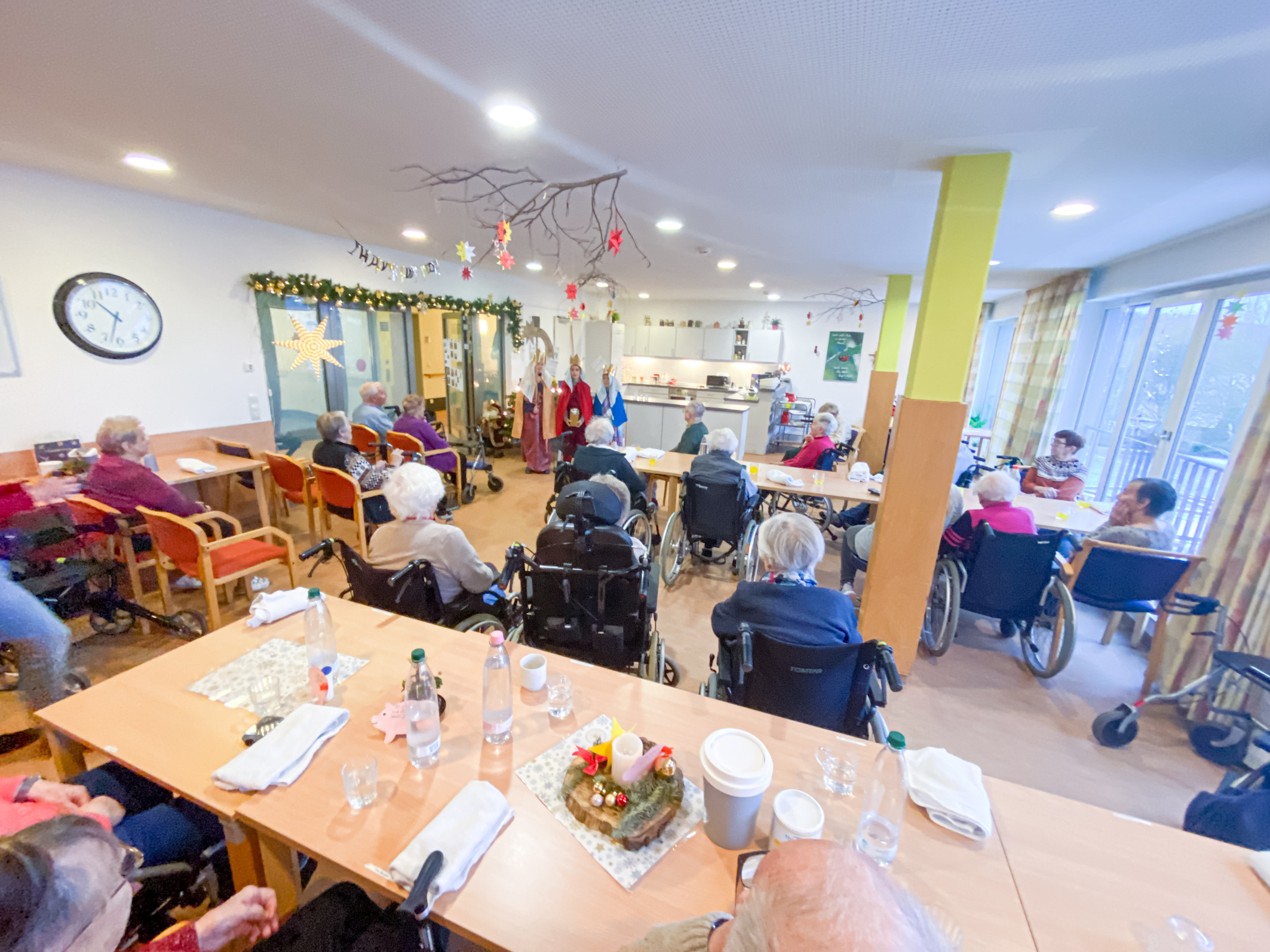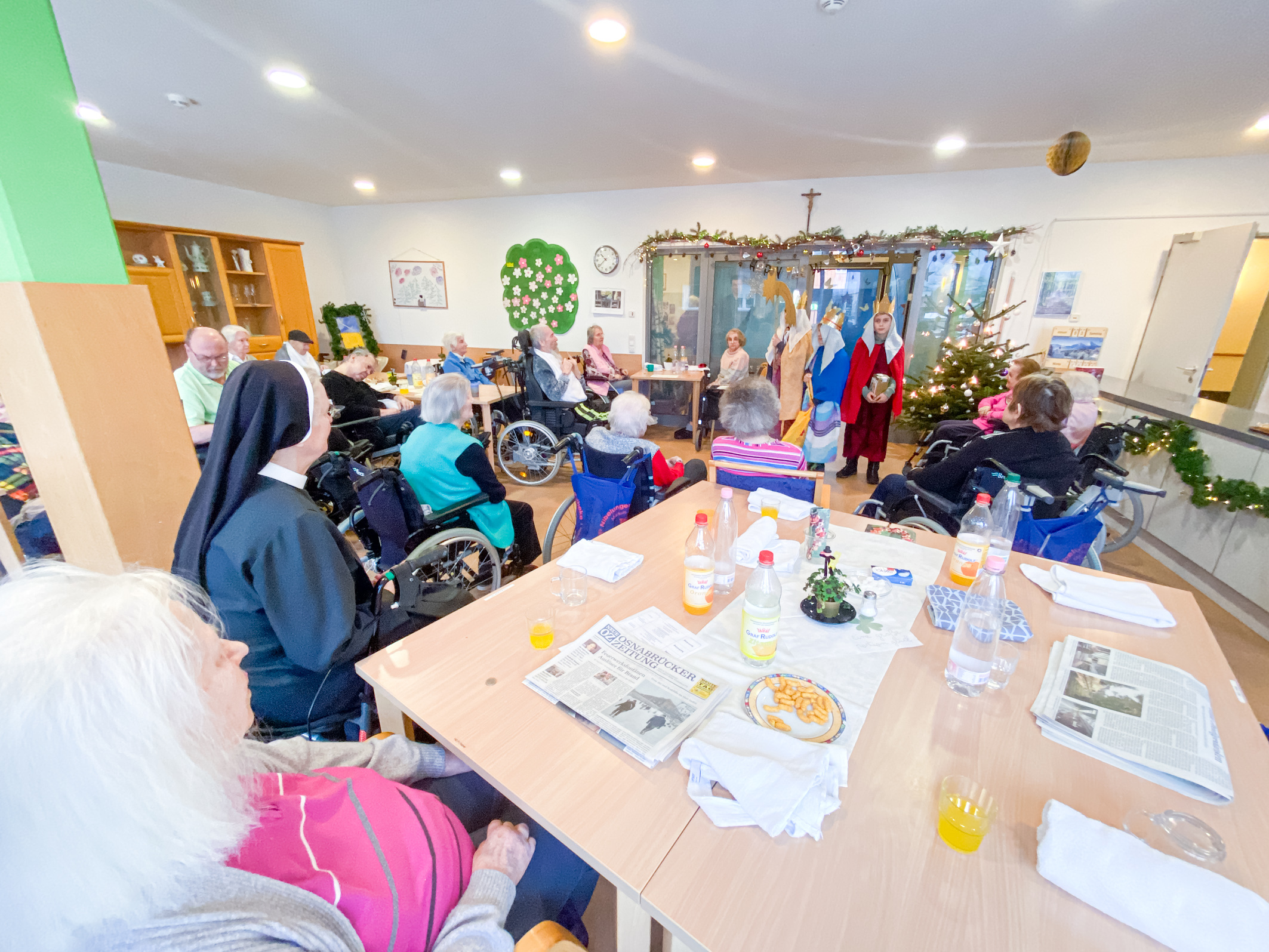 Die Sternsingergruppe – die drei Söhne unseres Einrichtungsleiters – besuchte gemeinsam mit Schwester Johanna Maria alle Bewohnerinnen und Bewohner in den Speiseräumen sowie auf den Zimmern. Mit Liedern und vorgetragenen Gedichtzeilen brachten sie Freude ins Haus, und jeder Wohnbereich erhielt das traditionelle schriftliche Segenszeichen.
